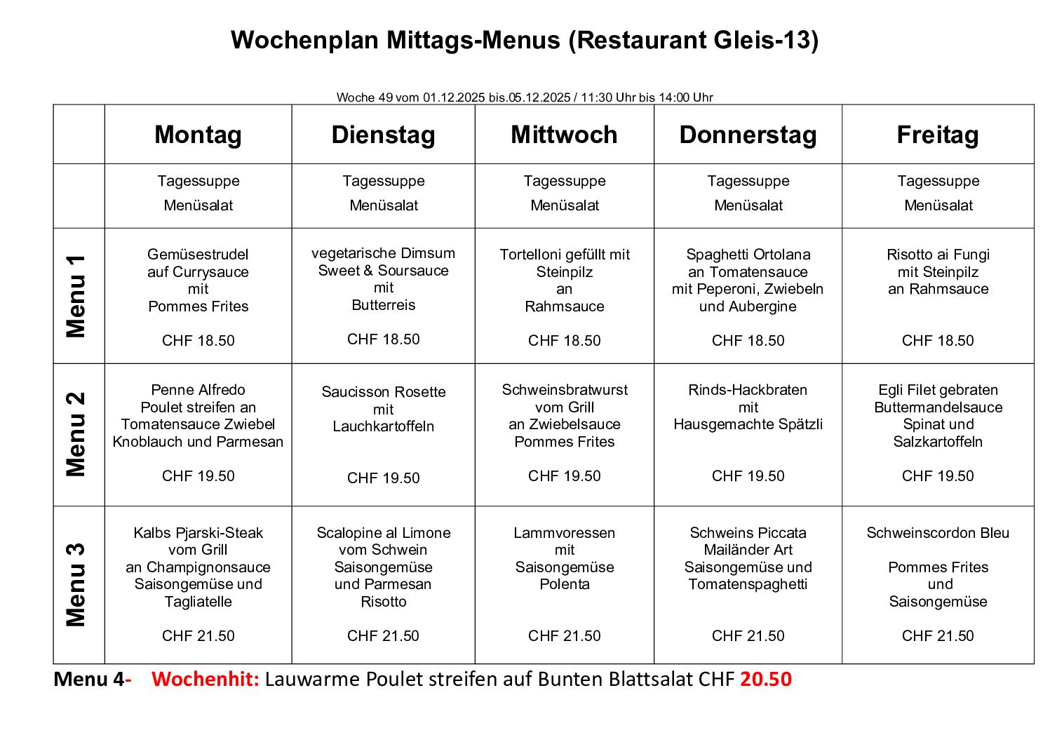 wo Tradition, Gastfreundschaft und köstliche Küche Hand in Hand gehen! Als Gleis 13 Teams heissen wir Sie herzlich willkommen in unserem gemütlichen Ambiente, das die warme Atmosphäre der Schweizer Tradition widerspiegelt.