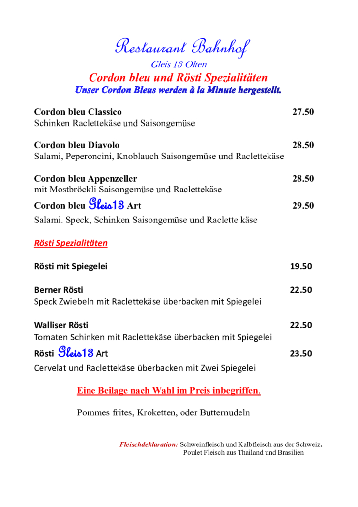 Unsere Spezialitäten sind unsere Fleischgerichte, die von zartem Schweizer Kalbs bis hin zu saftigen Cordon Bleus die à la Minute hergestellt werden.