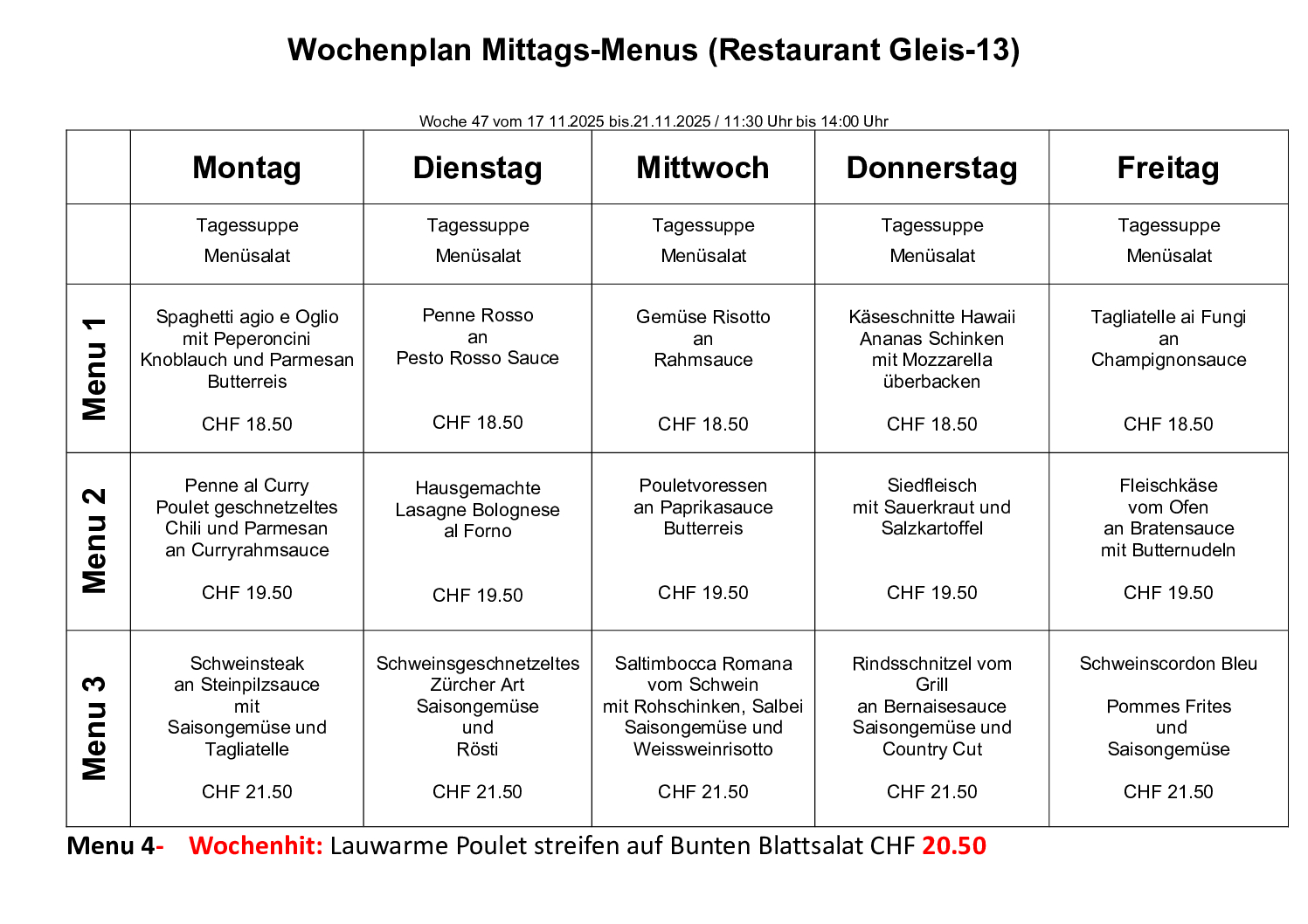 - Pouletsalat Gleis13 ArtFr. 23.50Pouletbruststreifen gebraten serviert mit Pommes Frites oder garnierter Salat
